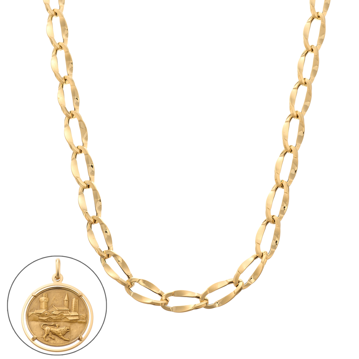 [商品内容] ・ネックレス ・メダルペンダントヘッド(プレゼント) <ネックレス> 総重量(約) 43cm:6.4g 60cm:8.4g 長さ(約) 43.0cm 60.0cm 幅(約) 7.5mm チェーンの形状 デザイン 留具の形状 ロブスター アジャスターの有無 無 [地金] 18Kイエローゴールド 【イタリア製】 <ペンダントヘッド> ヘッドの縦×横(約):37.5×27.0mm バチカンの内径(約):5.8×3.8mm 総重量(約)5.1g [地金] 真鍮 [メッキ] 金色メッキ [仕上げ] アンティーク仕上げ 【イタリア製】 ■受注発注商品のためデザイン・価値に影響のない範囲で仕様が変わる場合がございます ■素材の大きさ・形・色合い、製品のサイズは1点1点多少異なります ■メダルペンダントヘッドに#755102、#755132ネックレスは通りません。お手持ちのチェーンに通してお使いください <ネックレス> ■中空製品のため、強い衝撃を与えますと破損や変形の恐れがありますのでご注意ください。 ■製造工程上、小さな丸い穴が開いている場合がございます。また、穴周辺にキズやへこみが付いてしまうことがあります。個々に穴の数・位置は異なります