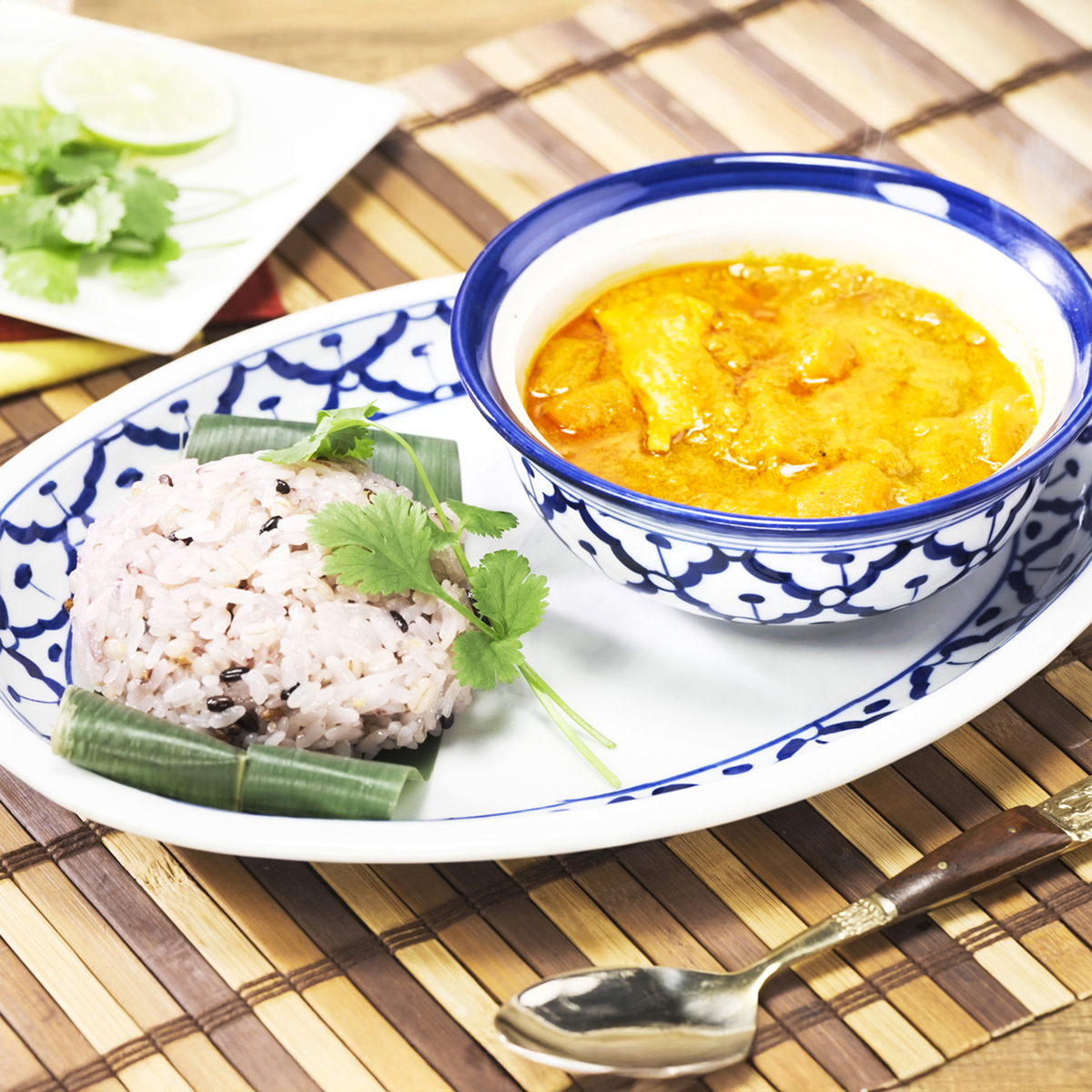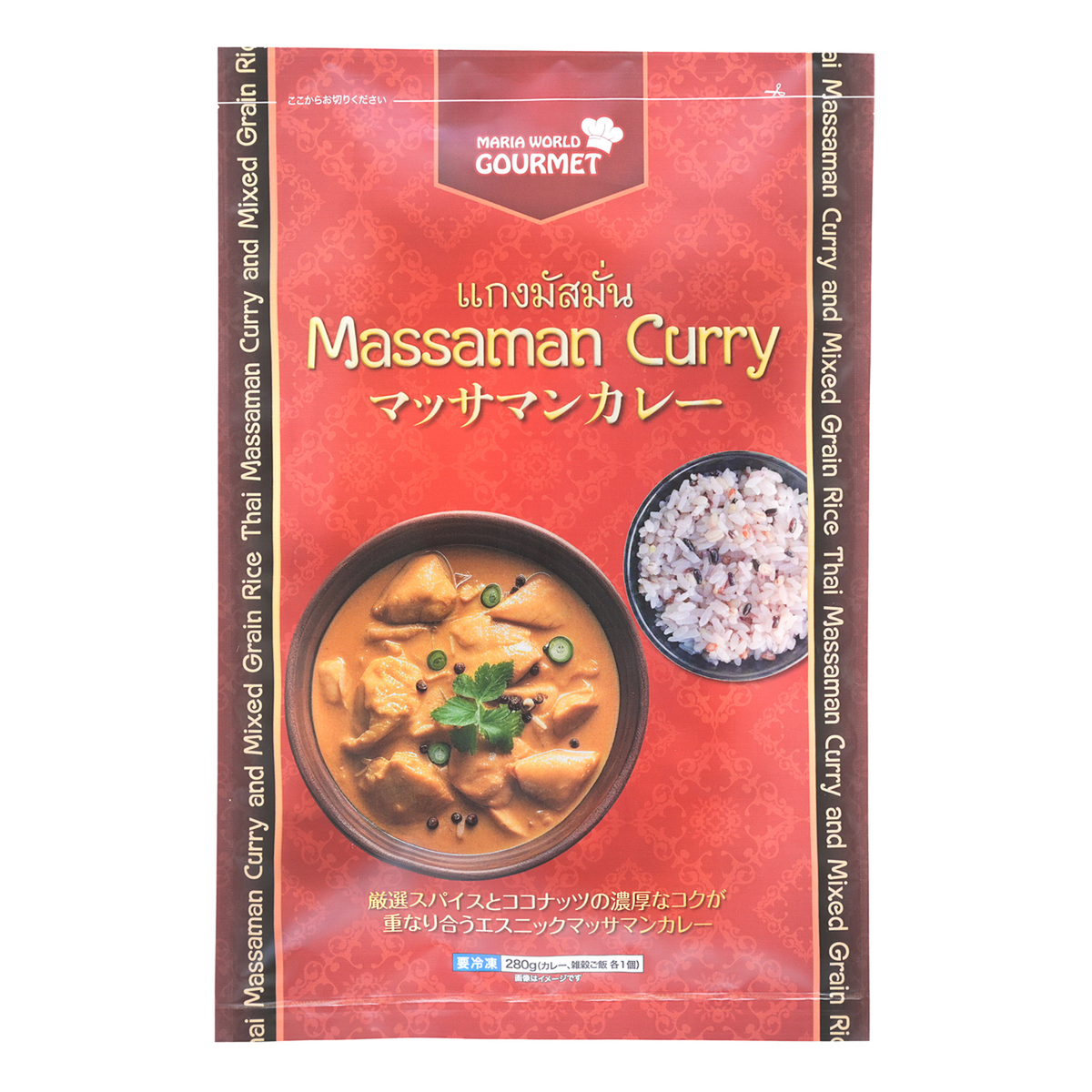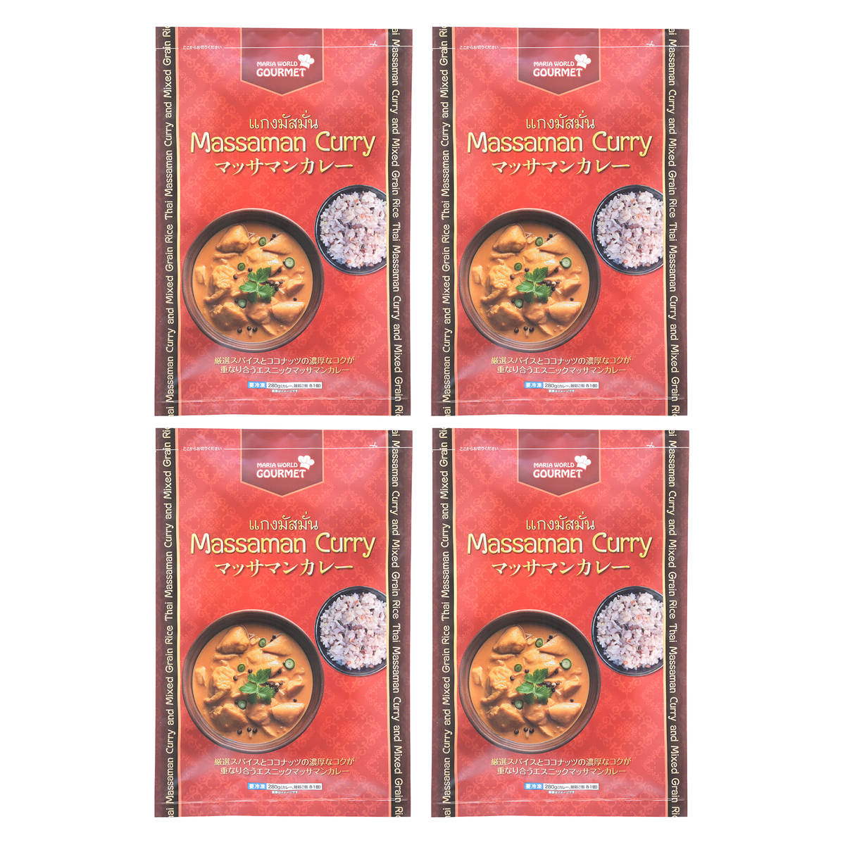 タイで製造したマッサマンカレーと国産の雑穀ご飯の4食セット。カレーは沸騰したお湯にパックを入れて加熱、雑穀ご飯は電子レンジで温めるだけ。忙しい日や、手間をかけずに美味しい食事をしたいときにぴったりです
