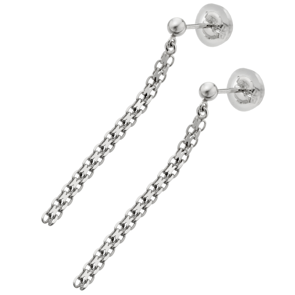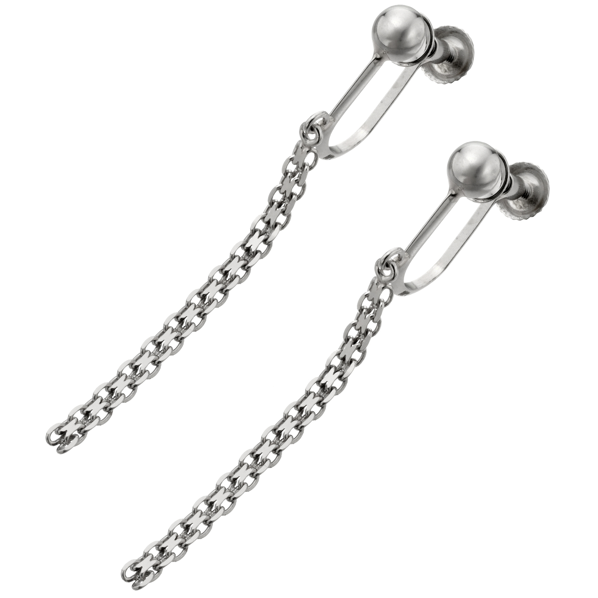 本体に純プラチナを使ったビスマルクチェーンのイヤリングまたはピアスです。幅感のあるチェーンが揺れるたびに耳元で光を受け、揺らめきながら落ちるようなデザインです
