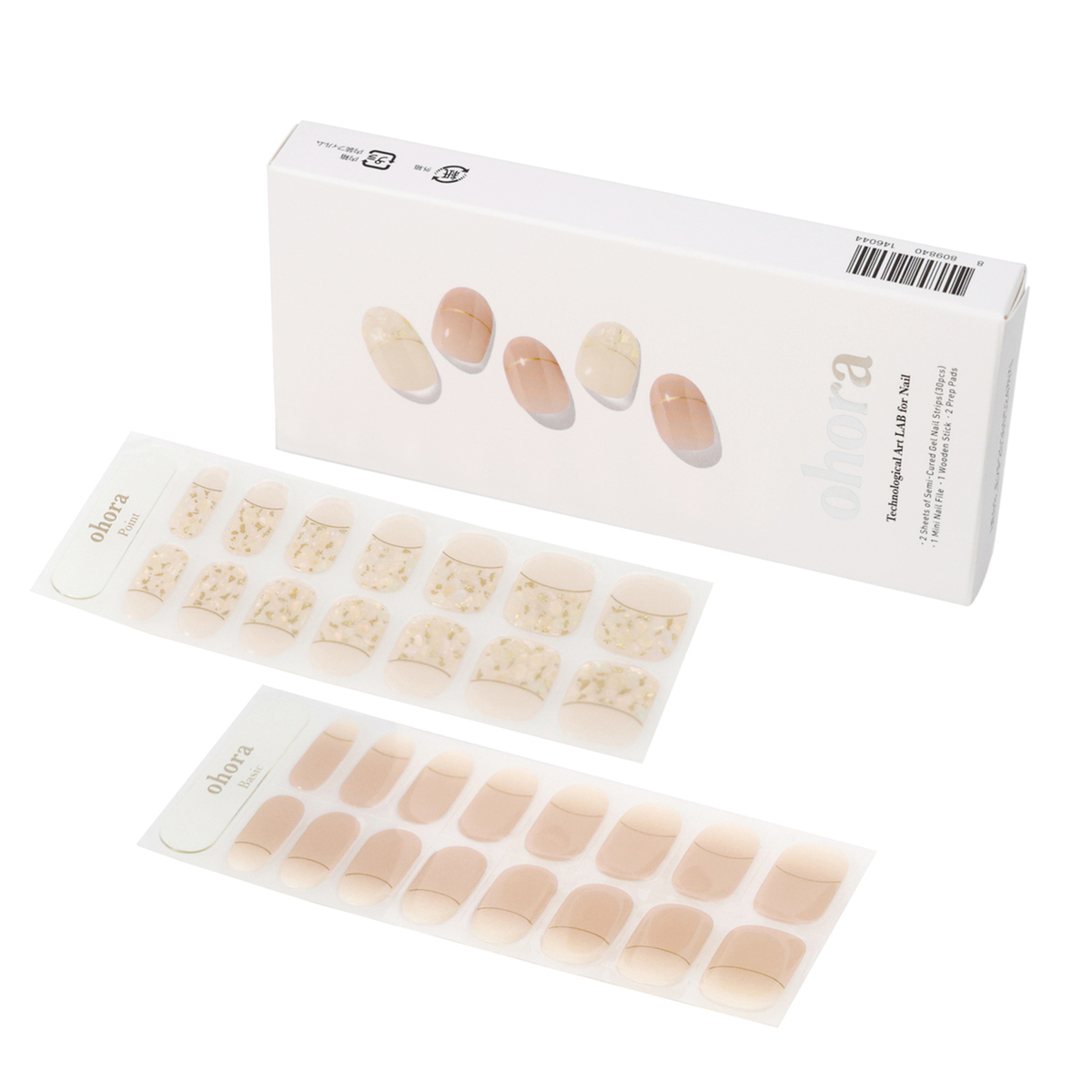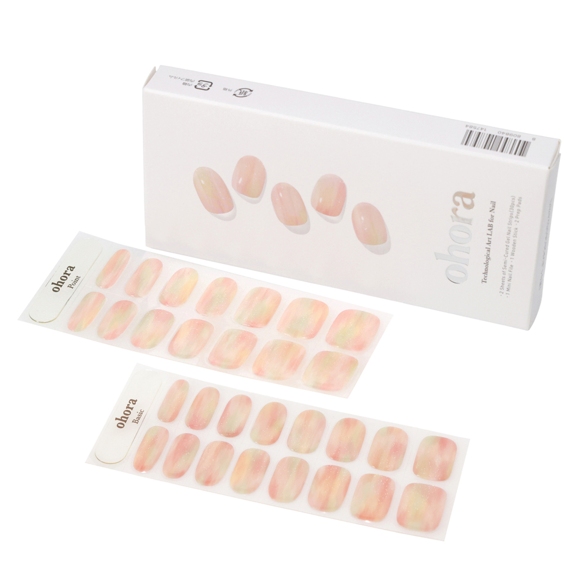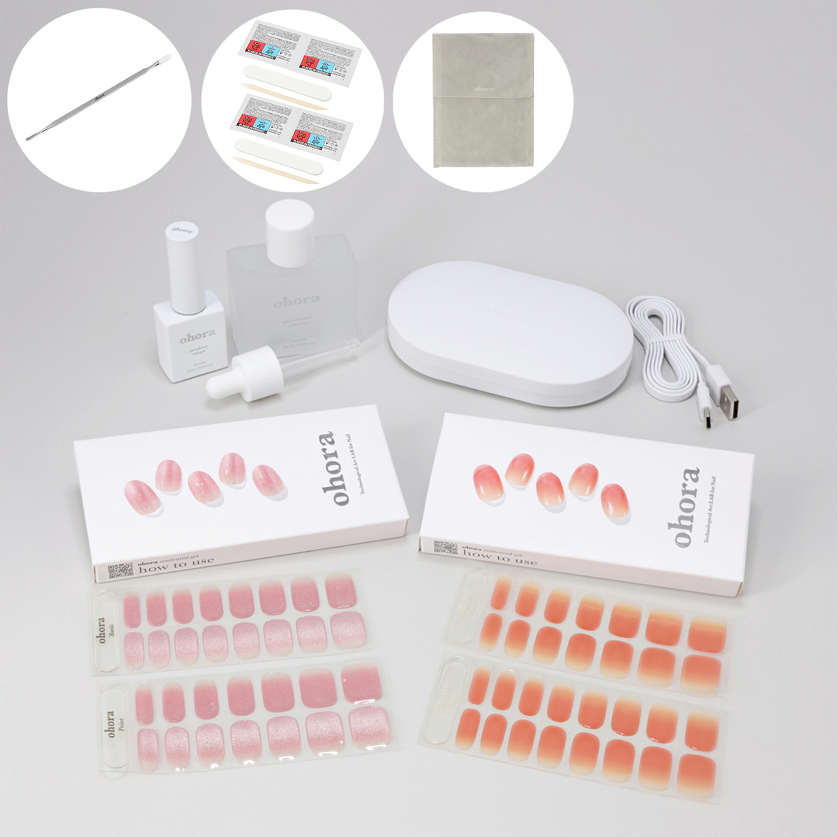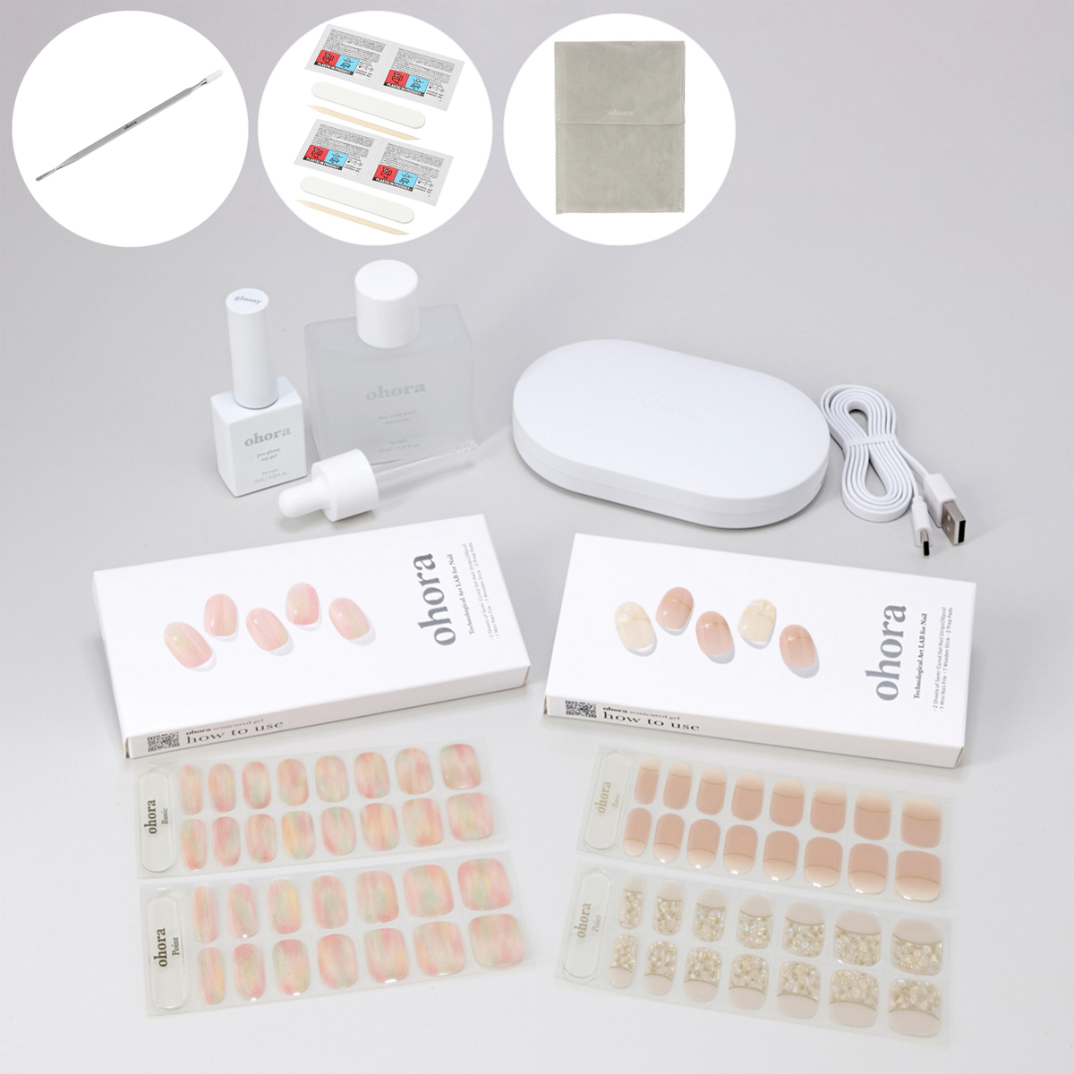 [セット内容] ・ジェルネイルシート(シート2枚(30ピース)、ネイルファイル、ウッドスティック、プレップパッド×2)×2 ・LEDポータブルジェルランプ(USBケーブル付属) ・トップジェル10ml ・リムーバー50ml ・デュアルスティック ※ACアダプターは付属しません。出力5V/2A以上のアダプターの使用を推奨します <LEDポータブルジェルランプ> [サイズ] 13×8×2.5cm [重量] 約46g [充電時間] 120分充電で40分使用可能 [使用方法] ネイルの付け方 1:爪表面をきれいに 事前に手を洗い、付属のプレップパッドで爪表面と手指をしっかりと拭いてください 2:シールを貼り付ける 爪のサイズに合うネイルシールを選び、キューティクルラインから少し離してはります 3:余った部分を切り取る 付属のネイルファイルで余分な部分を切り取ります。爪切りやはさみを使ってもOK 4:ランプで硬化する ジェルランプで1〜3回硬化後、ネイルファイルできれいに整えて仕上げます ネイルの外し方 1:リムーバーを垂らす 爪のまわりにリムーバーを数滴垂らし、爪とネイルシールの隙間に浸透するまで待ちます 2:爪との間に隙間をつくる 付属のウッドスティックにリムーバーを染み込ませ、爪とシールの間にゆっくりと押し込んで隙間をつくります 3:ゆっくりと取り外す 爪とシールの隙間に追加でリムーバーを流し入れ、十分に浸してから取り外してください 【韓国製(LEDポータブルジェルランプは中国製)】 [注意事項] ※付属のプレプパッドは一部パッケージの仕様が異なる場合がございます ※直射日光(紫外線)に当たると、ジェル成分が固まって使えなくなります ※セミキュアジェルの保管やUVLEDジェルランプを使用する際は、セミキュアジェルが日光に直接当たらないようにご注意ください。気温が下がるとセミキュアジェルが一時的に硬くなることがありますが、その際は温めて柔らかくしてからお使いください ※手の汗、水気、ハンドクリーム、オイルなどは接着力を低下させる主な原因になりますので、ご使用の前は石鹸などで手をきれいに洗い、油水分を完全に取り除いてください ※手足の爪やその周りの皮膚に異常を感じた場合は、直ちにご使用をおやめください ※使用後の交換・返品はお受けできかねますので、予めご了承ください <LEDポータブルジェルランプ> ※ACアダプターは付属しません。出力5V/2A以上のアダプターの使用を推奨します ※ランプの使用前に使用説明書を熟知してください ※定められた用途以外には使用しないでください ※子供の手が届かないところに保管してください ※使用しない時はUSBケーブルを分離して保管してください ※任意で製品の変更や改造及び分解しないでください ※湿気、ほこり、火気や水気のある場所では使用しないでください ※落下及び本体に衝撃が加わる場合、故障の原因となります ※製品をアセトン、アルコール、ベンゼンなどの化学薬品で拭くと、製品に損傷の恐れがあります ※使用中や使用後、又は充電中に本体が熱くなったり、異常を感じたときは使用を中止してください ※肌が赤く腫れ上がったり、火傷などの異常を感じた場合は、すぐに使用を中止してください ※健康に以上がある方、肌が敏感な方、妊娠中の方は使用前、担当医者にご相談した後、ご使用ください ※電源が故障したり、正常に作動しない場合、製品が破損された場合には使用せず、ご購入先へお問い合わせください ※点灯中にUV LEDランプを直接見ないでください ※製品仕様に表記されている正確な電圧を使用してください ※硬化直後はランプが熱い恐れがありますので、ランプの中にある電球に触れないでください ※長時間充電せず、放置する場合は内臓バッテリーの使用寿命が短縮されますので、未使用の時でも3ヵ月に一度はフル充電をしてください ※内臓バッテリーから漏水が発生した場合、手で直接触れず、肌に触れた場合、流水などできれいに洗い、赤み、腫れ、かゆみなどの症状や副作用がある場合、皮膚科の専門医とご相談してください [成分] トップジェル:ジカルバミン酸ジHEMAトリメチルヘキシル、メタクリル酸エステルアクリエステル、HEMA、(アクリレーツ/アクリル酸エチルヘキシル/HEMA)コポリマー、メタクリル酸ヒドロキシプロピル、ヒドロキシシクロヘキシルフェニルケトン、ポリジエチルシロキサン、ダイシロキセイン リムーバー:炭酸プロピレン、水、エタノール、香料、リナロール、リモネン、サリチル酸ベンジル、加水分解コラーゲン、パンテノール、パントテン酸Ca、ビオチン、トリペプチドー1銅