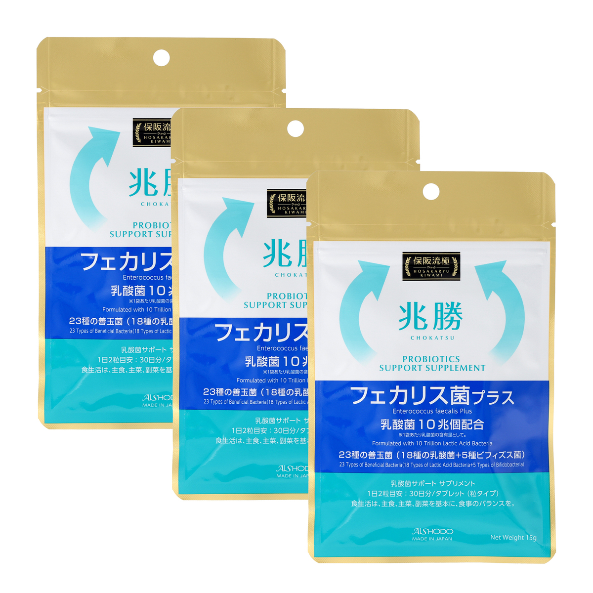 [アレルギー物質特定原材料8品目] なし [内容量] 60粒×3 [目安量] 1日2粒 [お召し上がり方] 1日2粒を目安に、水またはぬるま湯とともにお召し上がりください ※短期間で大量に摂ることは避けてください [栄養成分表示]1日2粒500mgあたり エネルギー 2.00kcal たんぱく質 0.03g 脂質 0.01g 炭水化物 0.44g 食塩相当量 0.0022g [注意事項] ※薬を服用・通院中の方、又は妊娠・授乳中の方は医師にご相談ください ※原材料をご参照の上、食物アレルギーのある方は摂取しないでください。また、体質や体調によりまれに合わない場合があります。その場合は摂取を中止してください ※成分特有のにおいや色の違いがありますが、品質に問題ありません ※乳幼児の手の届かないところに置いてください ※ぬれた手で触らずに、衛生的にお取り扱いください ※開封後はなるべく早くお召し上がりください ※乾燥剤は誤って召し上がらないでください ※食生活は、主食、主菜、副菜を基本に、食事のバランスを [原料原産地] 還元麦芽糖水飴(国内製造) [原産国] 日本 [原材料] 還元麦芽糖水飴(国内製造)、殺菌乳酸菌末(殺菌乳酸菌末(フェカリス菌)、デキストリン)、ポリデキストロース(水溶性食物繊維)、乾燥ビール酵母、難消化性デキストリン(水溶性食物繊維)、乳酸菌生産物質末、白桃花抽出物、酪酸菌末、殺菌乳酸菌混合末、中鎖脂肪酸含有粉末油脂/セルロース、ステアリン酸カルシウム、二酸化ケイ素、(一部に乳成分・大豆・ももを含む)