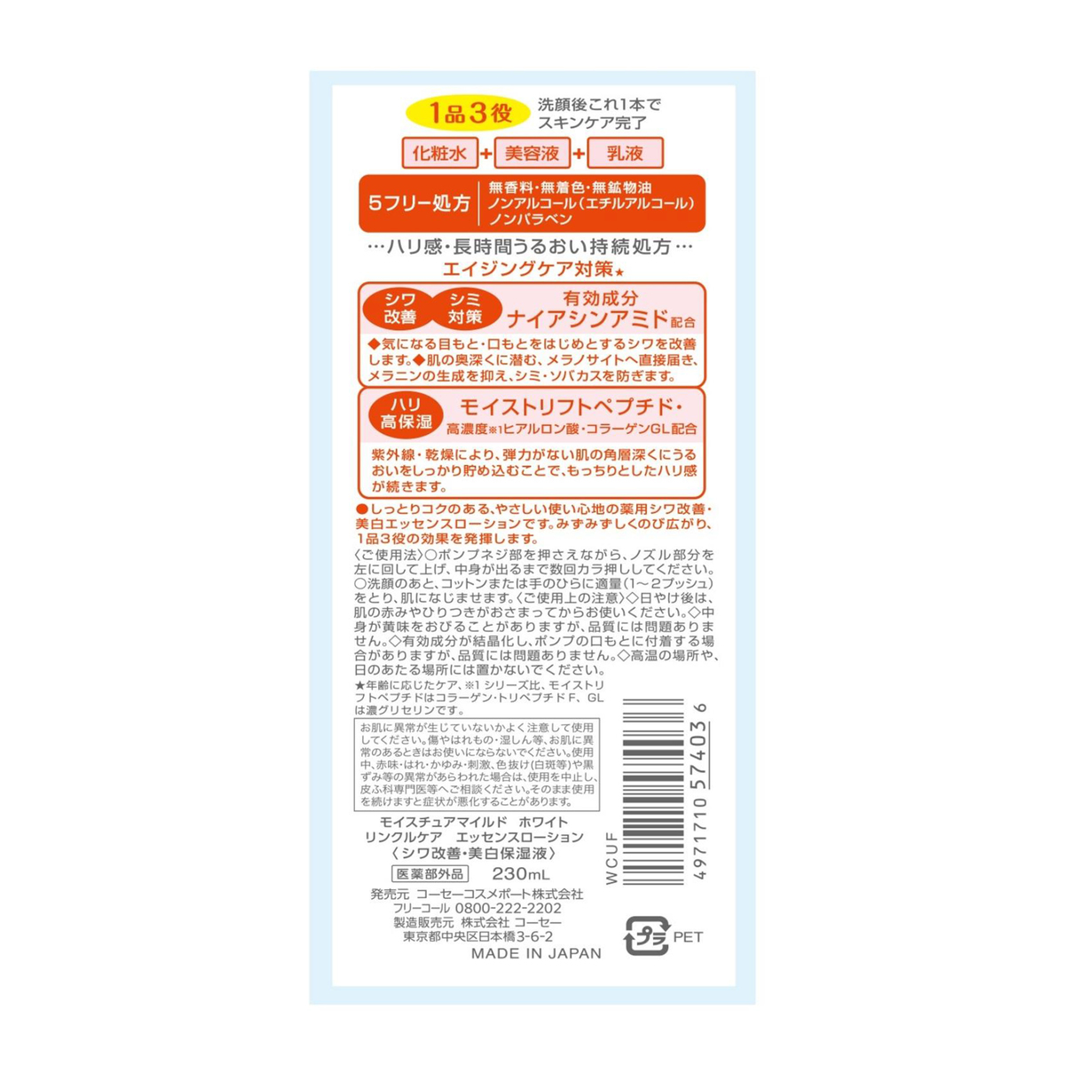 [商品内容] モイスチュアマイルド ホワイト リンクルケア エッセンスローション (医薬部外品) 230ml [使用方法] ポンプネジ部を押さえながら、ノズル部分を左に回して上げ、中身が出るまで数回カラ押ししてください 洗顔のあと、コットンまたは手のひらに適量(1〜2プッシュ)をとり、肌になじませます 【日本製】
