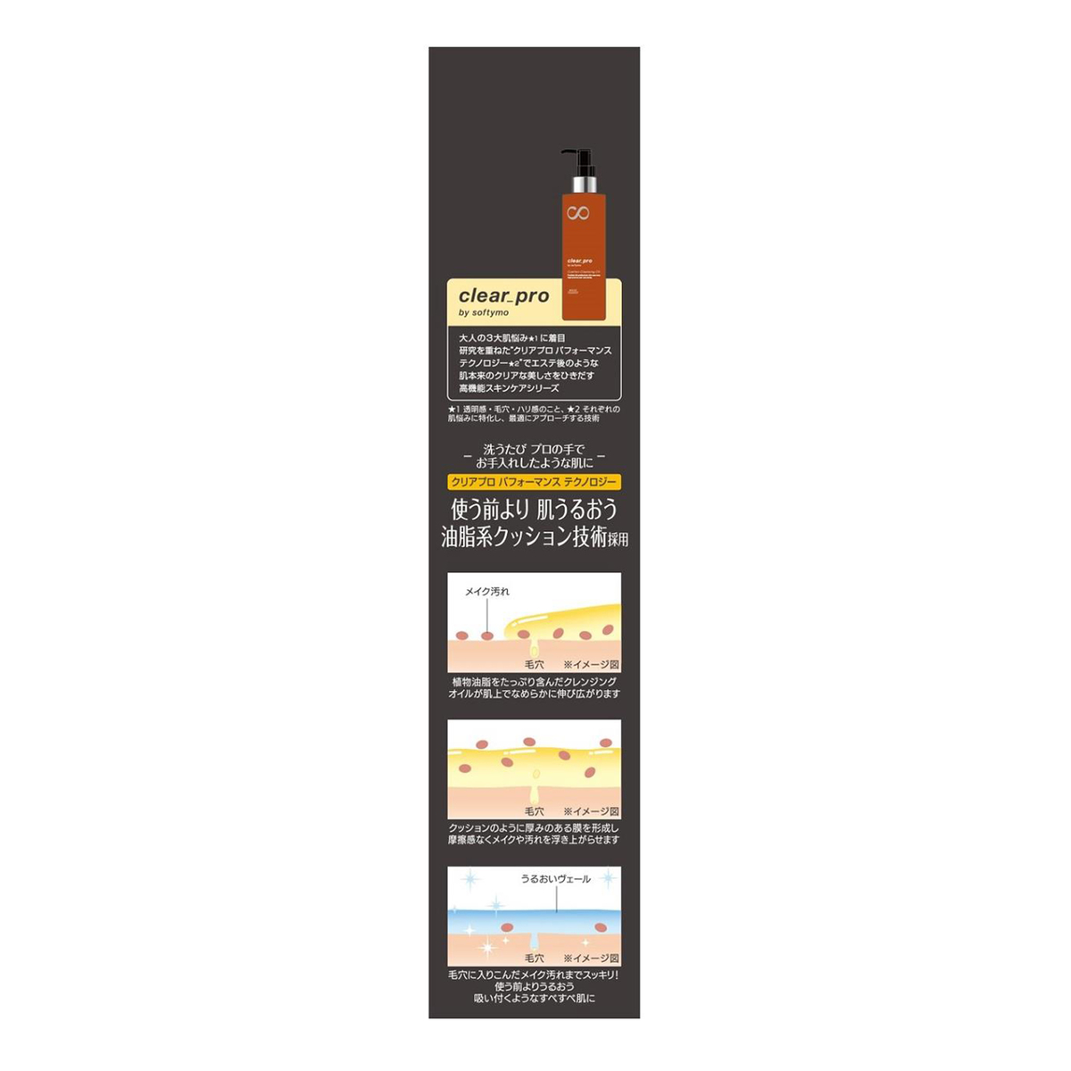 クッションのように厚みのある膜を形成し、摩擦感なく毛穴に入りこんだメイクや汚れまで浮き上がらせて、しっかり落とします