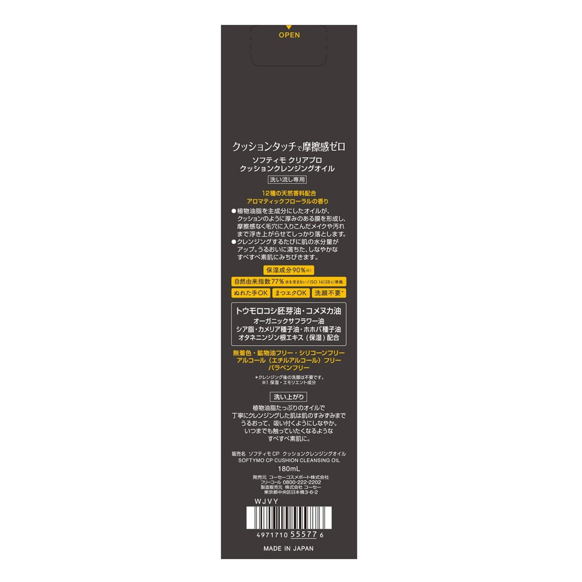 [商品内容] ソフティモCP クッションクレンジングオイル 180mL [使用方法] ・手のひらに適量(ポンプ2〜3回押し程度)をとり、メイクとよくなじませたあと、水かぬるま湯で充分に洗い流します ・手や顔が非常にぬれているときは、軽く水気をきってからお使いください 【日本製】