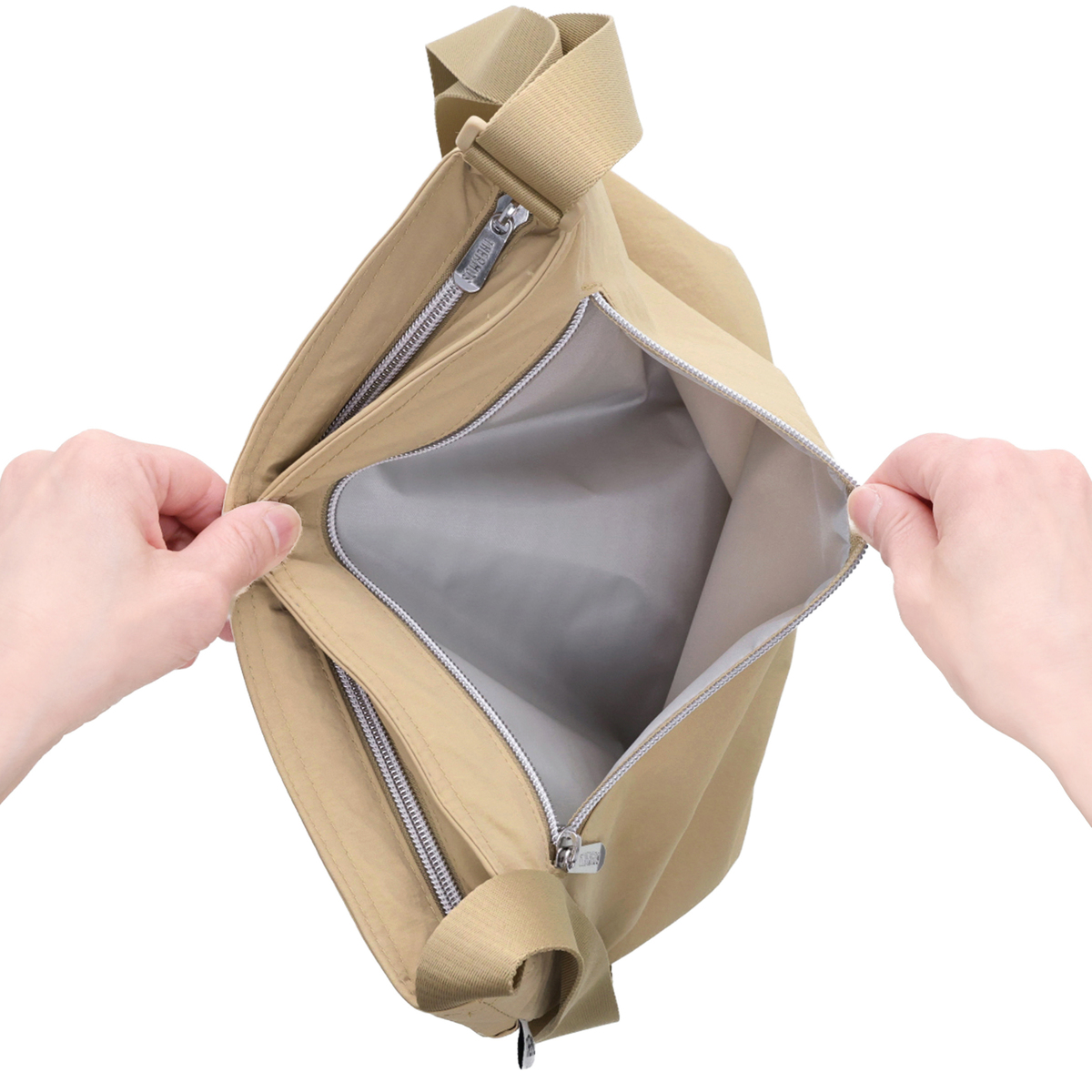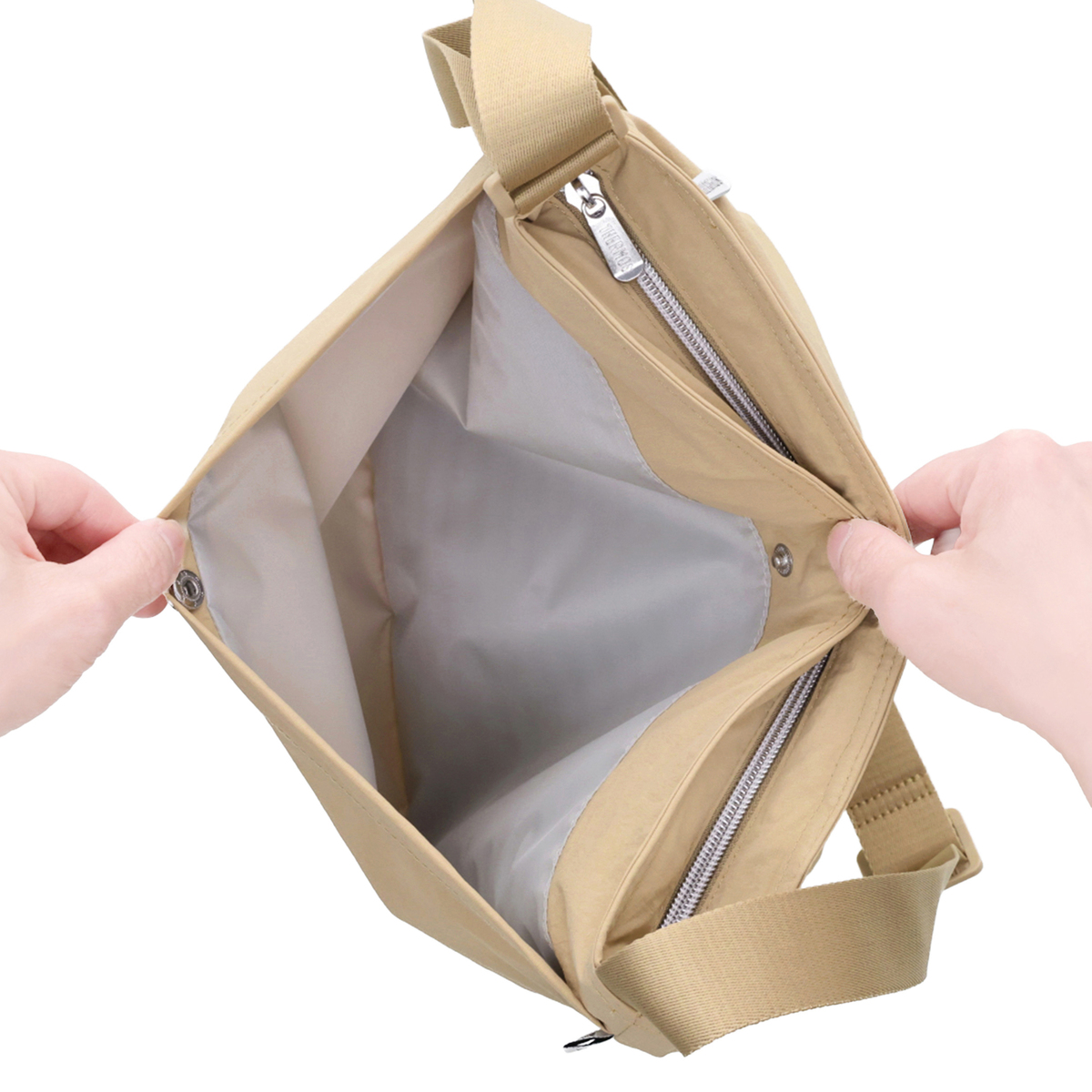 [サイズ(約)] 縦33×横24×マチ15cm ショルダー立ち上がり:32〜65cm [重量(約)] 200g [素材] 外生地:ナイロン 内生地:PEVA クッション(断熱材):発泡ポリエチレン、ポリプロピレン不織布 ※裏地有 [仕様] 開閉:ファスナー式 底ビョウ:無 [ポケット] <内側> メッシュポケット×1 <外側> スナップボタンポケット×1 ファスナーポケット×1 [注意事項] ※乳幼児の手の届くところには置かないでください。また、いたずらには十分に注意してください(けがの原因になります) ※首からかけないでください(他のものに引っかかり、窒息やけがの原因になります) ※体の正面(腹部)に製品がこないように調整してください(転倒時、腹部を圧迫してけがの原因になります) ※かけた状態で走ったり、運動したりしないでください(引っかかりによる窒息や、接触によるけがの原因になります) ※ショルダーバッグ・保冷バッグの目的以外に使用しないでください ※火気に近づけないでください(やけどの原因になります) ※熱い食品などは入れないでください(腐敗や変質、内生地の損傷の原因になります) ※水や氷を直接入れないでください(漏れてものを汚す原因になります) ※割れやすいものを持ち運ぶ際は十分に注意してください ※使用環境により結露することがあります。周囲を濡らす恐れがあるため、特に電子機器などは入れないでください ※車内や直射日光の当たる高温の場所に長時間放置しないでください(保冷性能の低下や腐敗の原因になります) ※ストラップを持って振り回したり、強く引っぱったりしないでください(周囲の人へのけがや、ストラップの破損の原因になります) ※ご使用後は、臭いや汚れを防ぐために必ずお手入れをしてください ※ドライアイスは入れないでください(生地破損の原因になります) ※鋭利なもの、重すぎるもの、大きすぎるものは入れないでください ※バッグ内に水分がたまると、縫い目からしみ出ることがあります ※ファスナーはゆっくり動かしてください ※使用条件により色落ち・色移りする場合があります 【中国製】