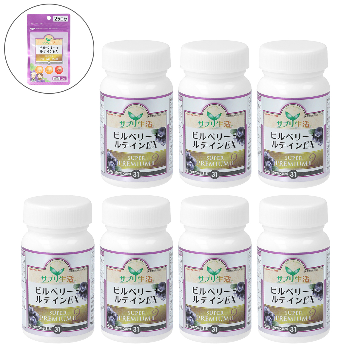 [セット内容] ・サプリ生活ビルベリー+ルテインEXスーパープレミアムII×7 ・サプリ生活ビルベリー+ルテインEX SプレミアムII 25粒(プレゼント) [原材料] ビルベリーエキス末(ビルベリーエキス、マルトデキストリン)(国内製造)、ヒマワリオイル、オリーブオイル、マリーゴールド抽出物/ゼラチン、グリセリン、ミツロウ、グリセリン脂肪酸エステル、カラメル色素、ヘマトコッカス藻色素、ビタミンA、(一部に大豆・ゼラチンを含む) [原材料] ビルベリーエキス末(ビルベリーエキス、マルトデキストリン)(国内製造)、ヒマワリオイル、オリーブオイル、マリーゴールド抽出物/ゼラチン、グリセリン、ミツロウ、グリセリン脂肪酸エステル、カラメル色素、ヘマトコッカス藻色素、ビタミンA、(一部に大豆・ゼラチンを含む)