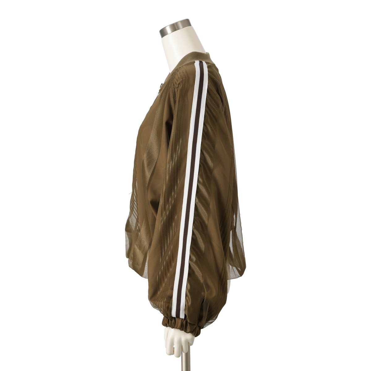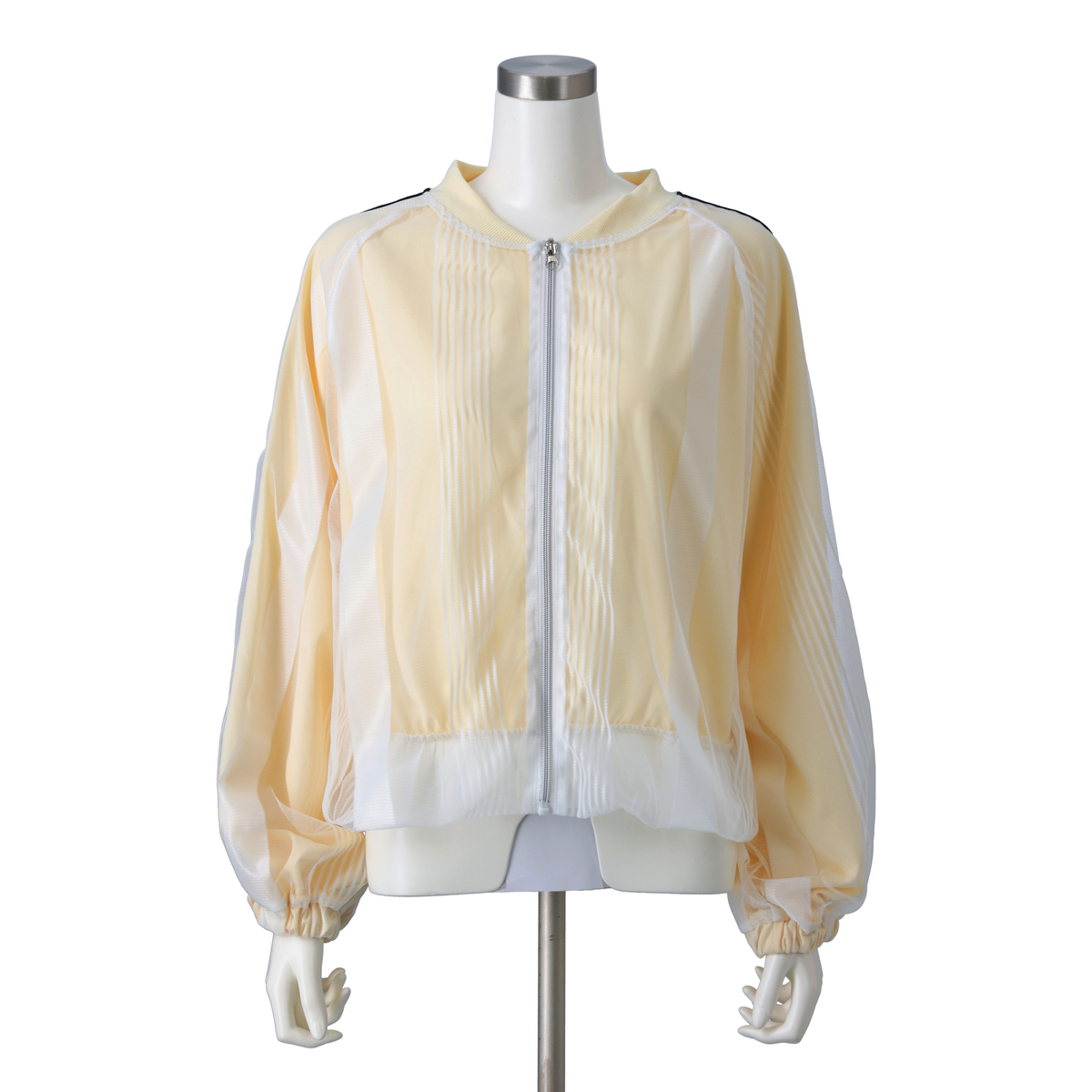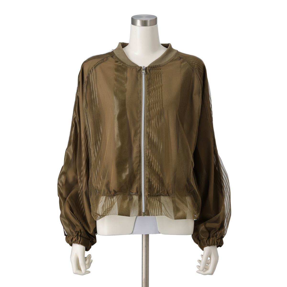 透け感のあるストライプが印象的な、エアリーな着心地のジップアップブルゾンです。光をやわらかく通すことで、フェミニンな雰囲気と抜け感を演出。縦ラインがすっきりとした印象を与え、羽織るだけでスタイリングに季節感と奥行きをもたらします