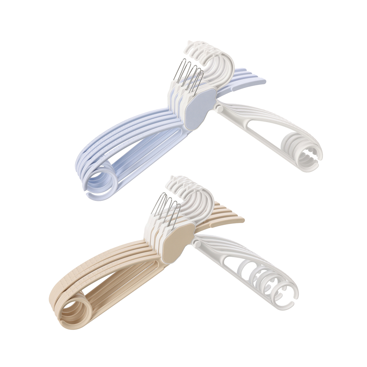 縦に連結できるフック付きで、クローゼットのスペースを有効活用できるアイテム。肩部分はゆるやかなカーブで、ニットやTシャツも跡がつきにくく形をきれいにキープ。キャミソールなどの紐も掛けられるフックがあり、いろいろな洋服に対応します