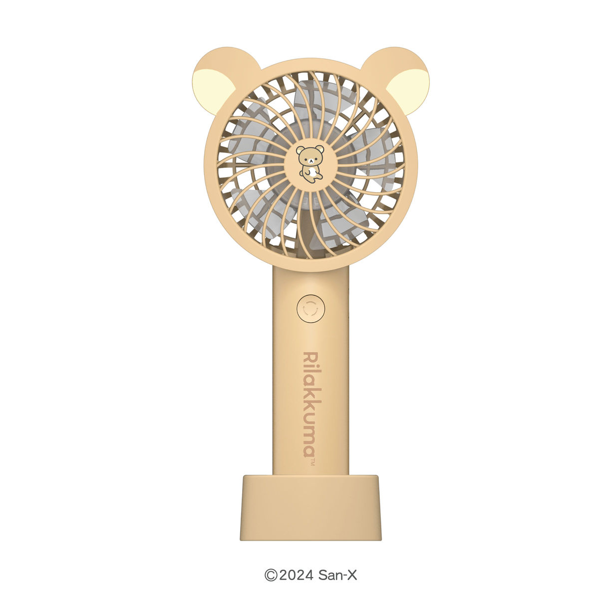 リラックマ カラーを模した本体色で、ファン中央とハンドル部にキャラクターとロゴが印刷されたハンディファン。取り外しできる耳パーツがアクセントになり、遊び心のあるデザインです