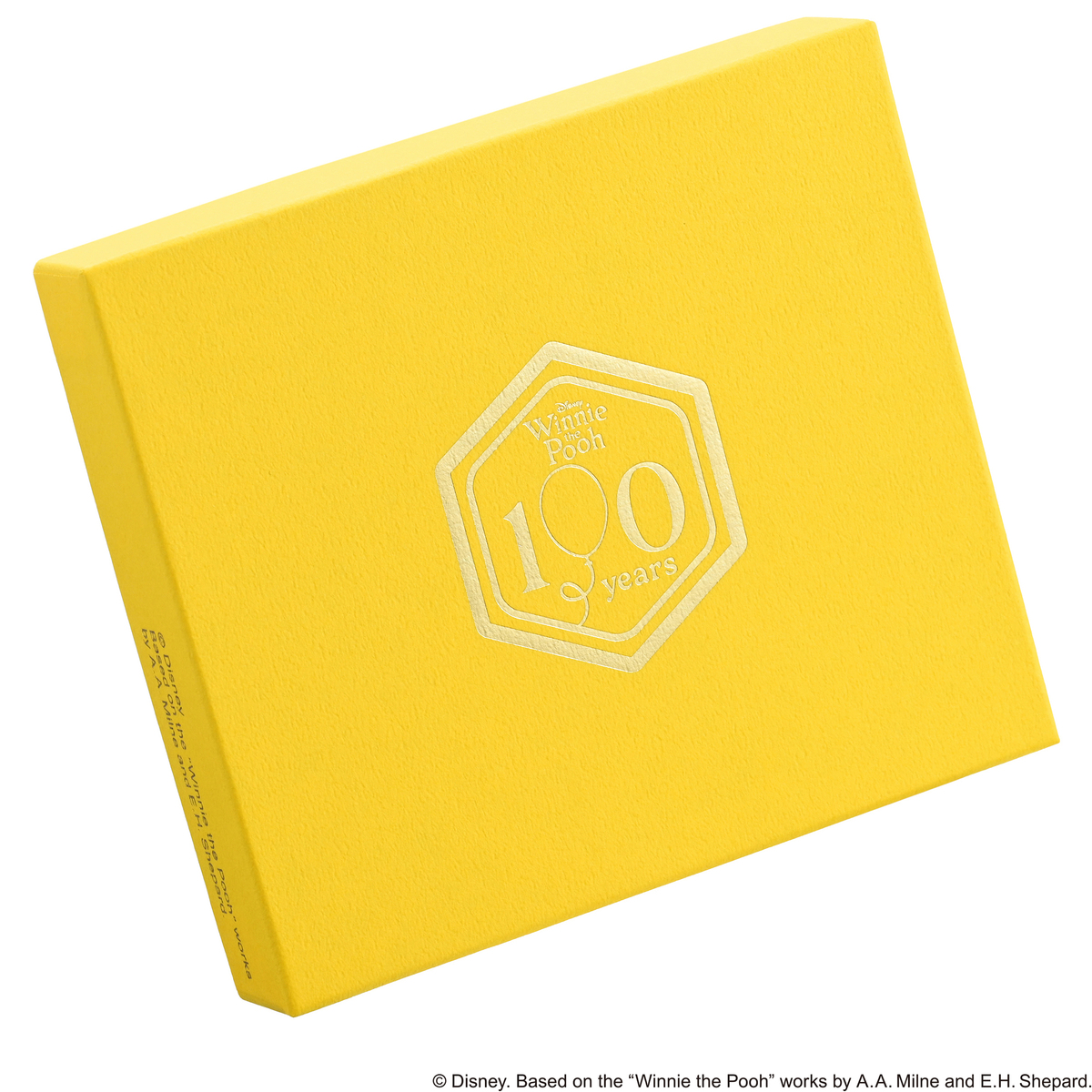 セット用ディスプレイケースには、100エーカーの森の仲間がプーさんと同じ赤いシャツを着てお祝いしている100周年限定アートをあしらいました
